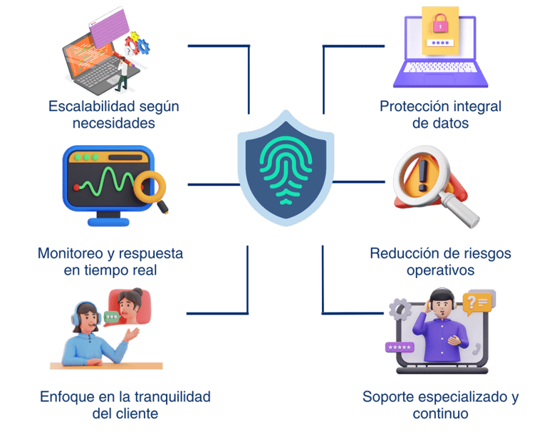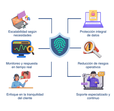 Enfoque en la tranquilidad del cliente: Nos encargamos de la seguridad para que tú te concentres en hacer crecer tu negocio, con la confianza de que tus sistemas y datos están siempre protegidos.